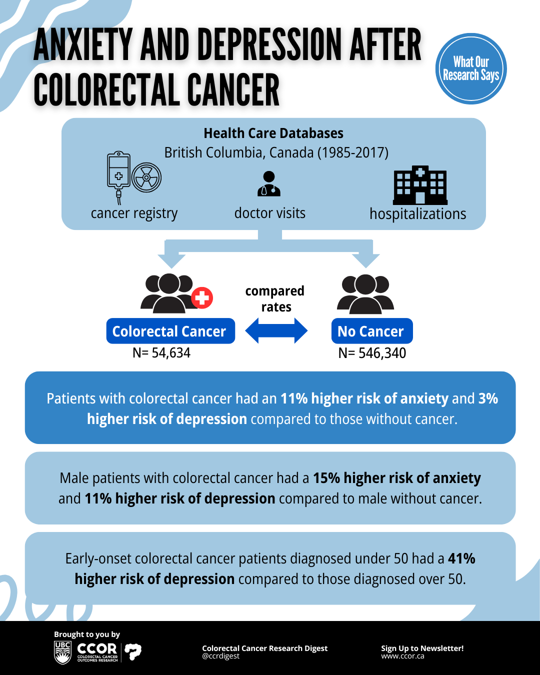 How we did this research: In this study, we used big data from British Columbia. We linked the BC Cancer Registry — which records every cancer diagnosis in the province — with health databases capturing doctors’ visits and hospitalizations. This allowed us to follow nearly 55,000 people diagnosed with colorectal cancer between 1985 and 2017, and compare them to almost 550,000 individuals of the same age and sex who did not have cancer. With this large dataset, we were able to track new cases of anxiety and depression over time and assess how the risk differed between those with and without colorectal cancer.