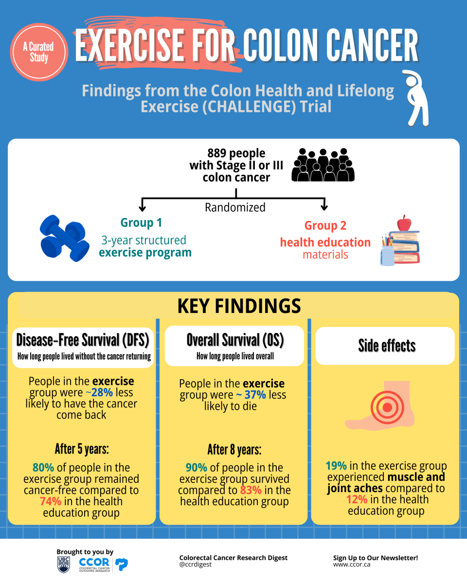 How this research was done: The CHALLENGE trial included 889 people with stage II or III colon cancer. All had completed chemotherapy and were doing less than 150 minutes of exercise per week — the amount usually recommended for good health. Participants were randomly assigned to one of two groups. One group took part in a 3-year structured exercise program with coaching and support, while the other received health education materials. Everyone was then followed for nearly 8 years to see whether exercise influenced disease-free survival (how long people lived without the cancer returning), overall survival (how long people lived overall), fitness and quality of life.