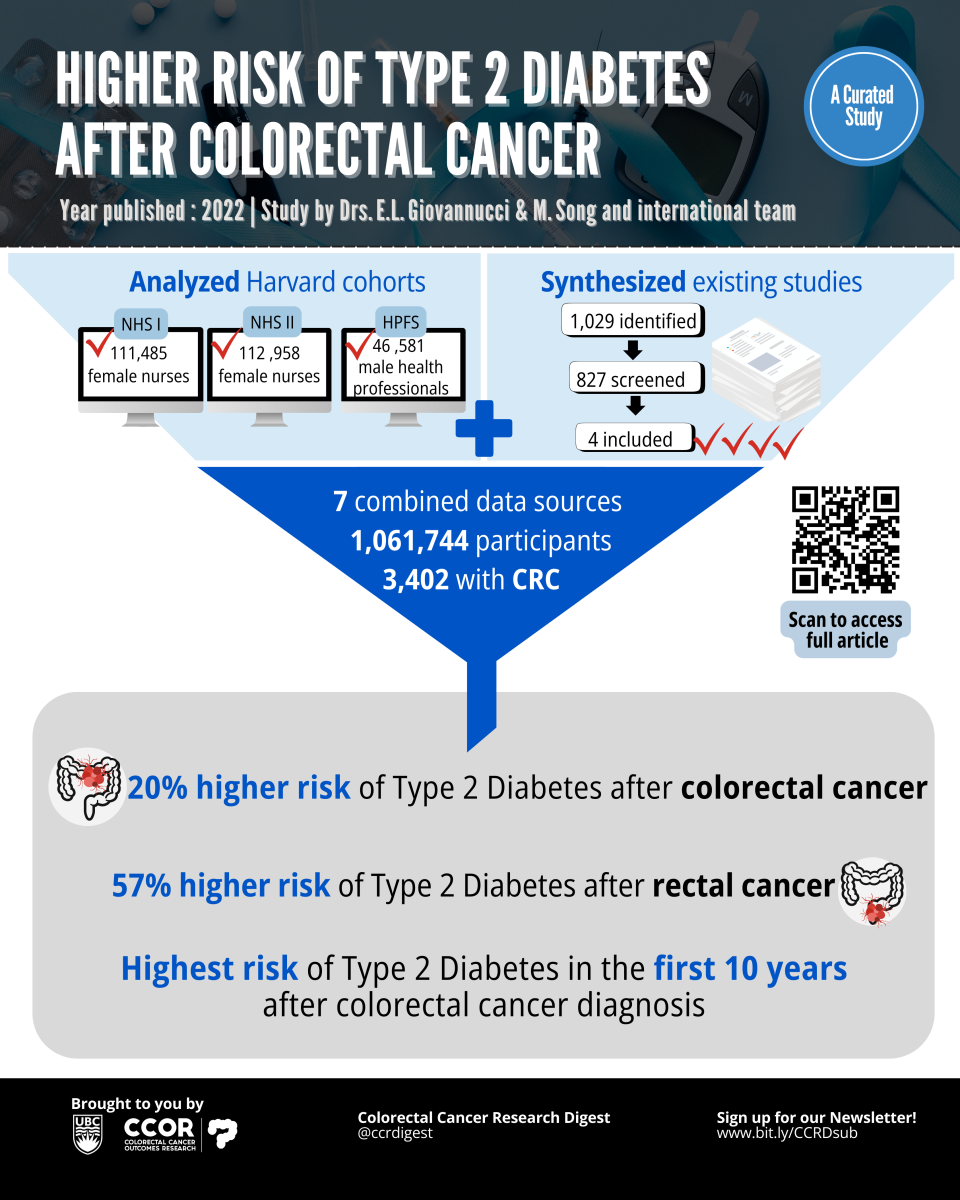 Why I found this study important: Overall, I appreciated the thoroughness of the study, especially the use of multiple analyses. This study answered the question I asked myself of whether my colorectal cancer diagnosis could also contribute to my risk for type 2 diabetes. It is important to note that we do not fully understand why people with colorectal cancer may be more likely to develop type 2 diabetes. Changes in gut bacteria, inflammation, and some treatments for colorectal cancer may all play a role.